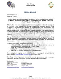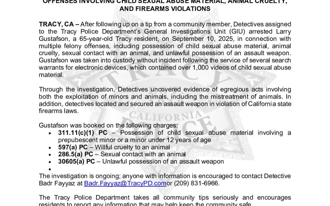 Tracy Police Arrest Suspect Following Investigation into Felony Offenses Involving Child Sexual Abuse Material, Animal Cruelty, and Firearms Violations