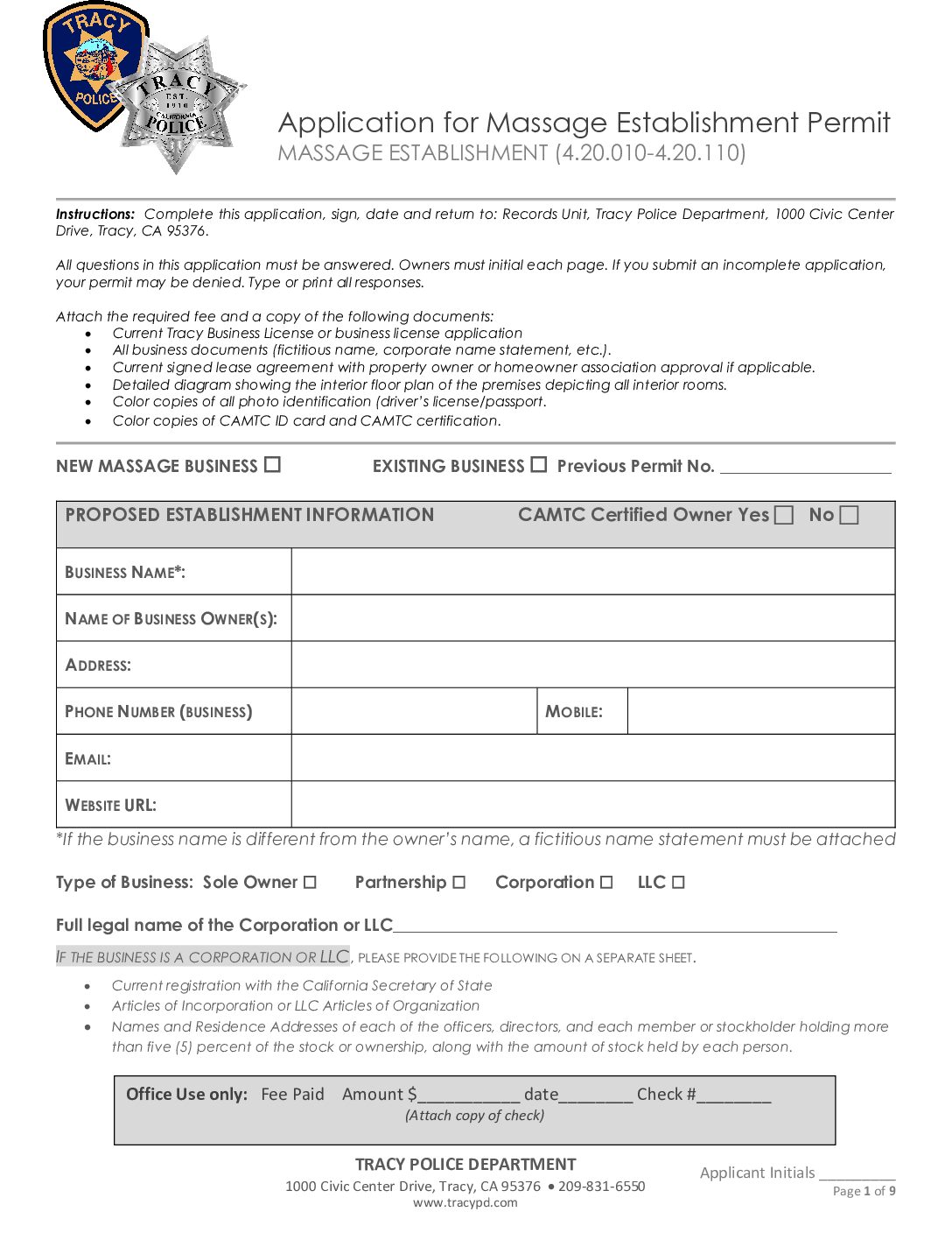 Application for Massage Establishment Permit by Kaylin Heefner | Nov 24, 2025 View/Download File Type: pdf File Size: 3 MB Categories: Permits and Licensing